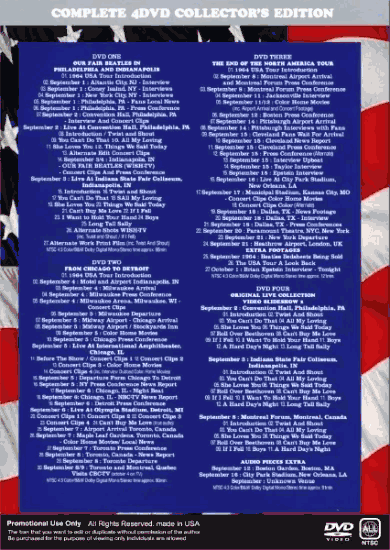 主な収録内容 September 4: Milwaukee Arena, Milwaukee, WI - Concert Clips (inc. Twist And Shout / You Can't Do That) September 5: Chicago, IL - Color Home Movies September 5: International Amphitheater, Chicago, IL - Before The Show And Concert Clips 1 (inc. Sounds Incorporated / All My Loving) - Concert Clips 2 (inc. You Can't Do That / All My Loving / She Loves You) - Concert Clips 3 Color Home Movies September 6: Whittier Hotel, Detroit, MI - Press Conference September 6: Olympia Stadium, Detroit, MI - Concert Clips 1 Color Footage (inc. She Loves You / Things We Said Today)