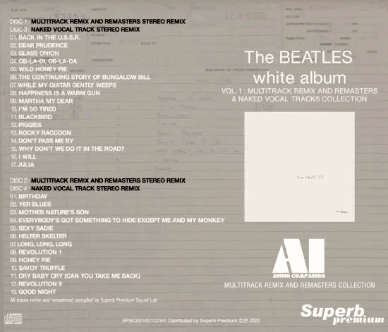 The white album VOL.2=DISC1/2 contains an original analog stereo mix that is not a sound source that has been digitally remastered and restored as [ORIGINAL ANALOG MASTER STEREO MIX]. It is a basic stereo mix that is engraved on vinyl records from the 60s because it is the opposite of the original sound source that is the opposite of the first half of DISC1. VOL.2=DISC3/4 is [BACKING TRACKS INSTRUMENTAL STEREO REMIX] contains all the songs on the album with only the vocal tracks turned off as much as possible. Some songs have unique remix-like features, such as backing tracks other than the lead vocals that leave the chorus, and this is the first instrumental recording of all songs on the album using the latest AI sound source analysis. The latest version of the 2022 remix and remastered sound source is essential for sound source research that approaches the Beatles sound analysis with AI sound source analysis that has evolved more than ever before. A must-listen audio album series for sound collectors newly reconstructed with the latest technology! This is a highly recommended collection! !