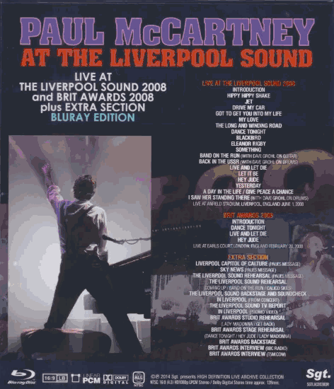 INTRODUCTION/HIPPY HIPPY SHAKE/JET/DRIVE MY CAR/GOT TO GET YOU INTO MY LIFE/MY LOVE/THE LONG AND WINDING ROAD/DANCE TONIGHT /BLACKBIRD/ELEANOR RIGBY/SOMETHING/BAND ON THE RUN (with Dave Grohl on guitar)/BACK IN THE USSR (with Dave Grohl on drums)/LIVE AND LET DIE/LET IT BE/HEY JUDE/YESTERDAY/A DAY IN THE LIFE - GIVE PEACE A CHANCE/I SAW HER STANDING THERE(with Dave Grohl on drums) Live at Anfield Stadium, Liverpool, England June 1, 2008 BRIT AWARDS 2008 INTRODUCTION/DANCE TONIGHT/LIVE AND LET DIE/HEY JUDE Live at Earls Court, London, England February 20, 2008 EXTRA SECTION LIVERPOOL CAPITOL OF CALTURE (Paul's Message)/SKY NEWS (Paul's Message)/THE LIVERPOOL SOUND REHEARSAL (Paul's Message)/THE LIVERPOOL SOUND REHEARSAL(Coming Up / Band On The Run / Calico Skies)/THE LIVERPOOL SOUND BACKSTAGE AND SOUNDCHECK/IN LIVERPOOL (From Concert)/THE LIVERPOOL SOUND TV REPORT/IN LIVERPOOL (Promo Video)/BRIT AWARDS STUDIO REHEARSAL (Lady Madonna / Get Back)/BRIT AWARDS STAGE REHEARSAL (Dance Tonight / Hey Jude / Lady Madonna)/BRIT AWARDS BACKSTAGE/BRIT AWARDS INTERVIEW (BBC Radio)/BRIT AWARDS INTERVIEW (t5m.com)