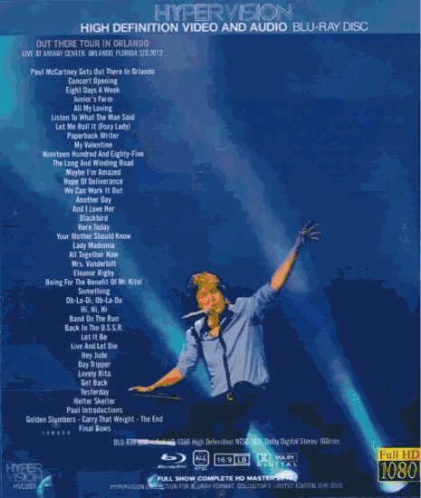 OUT THERE TOUR IN ORLANDO - LIVE AT AMWAY CENTER, ORLANDO, FLORIDA 5.18.2013 Paul McCartney Gets Out There In Orlando / Opening / Eight Days A Week / Junior's Farm / All My Loving / Listen To What The Man Said / Let Me Roll It (Foxy Lady) / Paperback Writer / My Valentine / Nineteen Hundred And Eighty-Five / The Long And Winding Road / Maybe I'm Amazed / Hope Of Deliverance / We Can Work It Out / Another Day / And I Love Her / Blackbird / Here Today / Your Mother Should Know / Lady Madonna / All Together Now / Mrs. Vanderbilt / Eleanor Rigby / Being For The Benefit Of Mr. Kite! / Something / Ob-La-Di, Ob-La-Da / Hi, Hi, Hi / Band On The Run / Back In The U.S.S.R. / Let It Be / Live And Let Die / Hey Jude / Day Tripper / Lovely Rita / Get Back / Yesterday / Helter Skelter / Paul Introductions / Golden Slumbers - Carry That Weight - The End / Final Bows