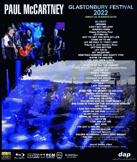 Paul McCartney performed at the Glastonbury Festival held for the first time in three years in 2022. Sir Paul, who just turned 80 the other day after completing his "GOT BACK" North American tour, performed a three-hour live performance as the headliner on June 25th, with a chorus of "Happy Birthday Paul" erupting from the venue. As a surprise guest in the second half, Dave Grohl, who had been interrupting the Foo Fighters live after Taylor Hawkins' sudden death, appeared! After Taylor's death, Dave appeared on the public stage for the first time with a nervous expression. He performed a furious performance of "I So She Standing There" and also performed "Band on the Run" as it was. In addition, Bruce Springsteen, who just co-starred with him at the final New Jersey performance of the North American tour, appeared! The co-starring of Boss's own "Glory Days" and the Beatles number "I want to Be Your Man" has been recreated. In addition, both of them took the stage again at the last encore "The End" and engaged in a guitar battle. It closed off Glastonbury's best performance and acclaimed stage ever. As a result, it became the strongest setlist longer than the "GOT BACK" North American tour, and this day's performance attracted attention from all over the world. It was also broadcast live on the BBC in the UK, but it was an incomplete broadcast with the narration of "Qualimen Story" in the middle of the TV broadcast and the performance of "In Spite of All the Danger" cut. This work is recorded as a DAP original in the Complete Master Edition, which includes all the songs of the concert. There is a slight difference between the TV broadcast broadcast that was broadcast live on the day and the WEBCAST broadcast later, but this Blu-ray is recorded in the highest quality Full HD (1920×1080) video in super beautiful quality without the BBC logo that continues to appear in the upper left corner of the screen. This Blu-ray version is the best way to enjoy it on the big screen! This performance, which has attracted worldwide attention as the greatest historical event in Glastonbury's history, is available in its complete uncut version! In addition, private backstage footage (three types of short footage shot by Mary McCartney) taken just before the performance is also included as a secret bonus. This is the definitive title of Sir Paul's "Glastonbury Festival 2022", which is a perfect item that will appear for the first time in the latest tour! !